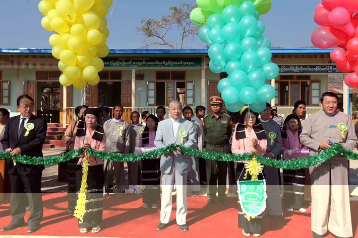 笹川陽平会長率いる日本財団は、長年ミャンマー全土でハンセン病制圧や学校建設などの活動を続けてきた――ミャンマーのシャン州南部にあるピンダヤの町で、小学校の新校舎を贈呈する式典に出席した笹川会長(中央、2013年2月9日)
