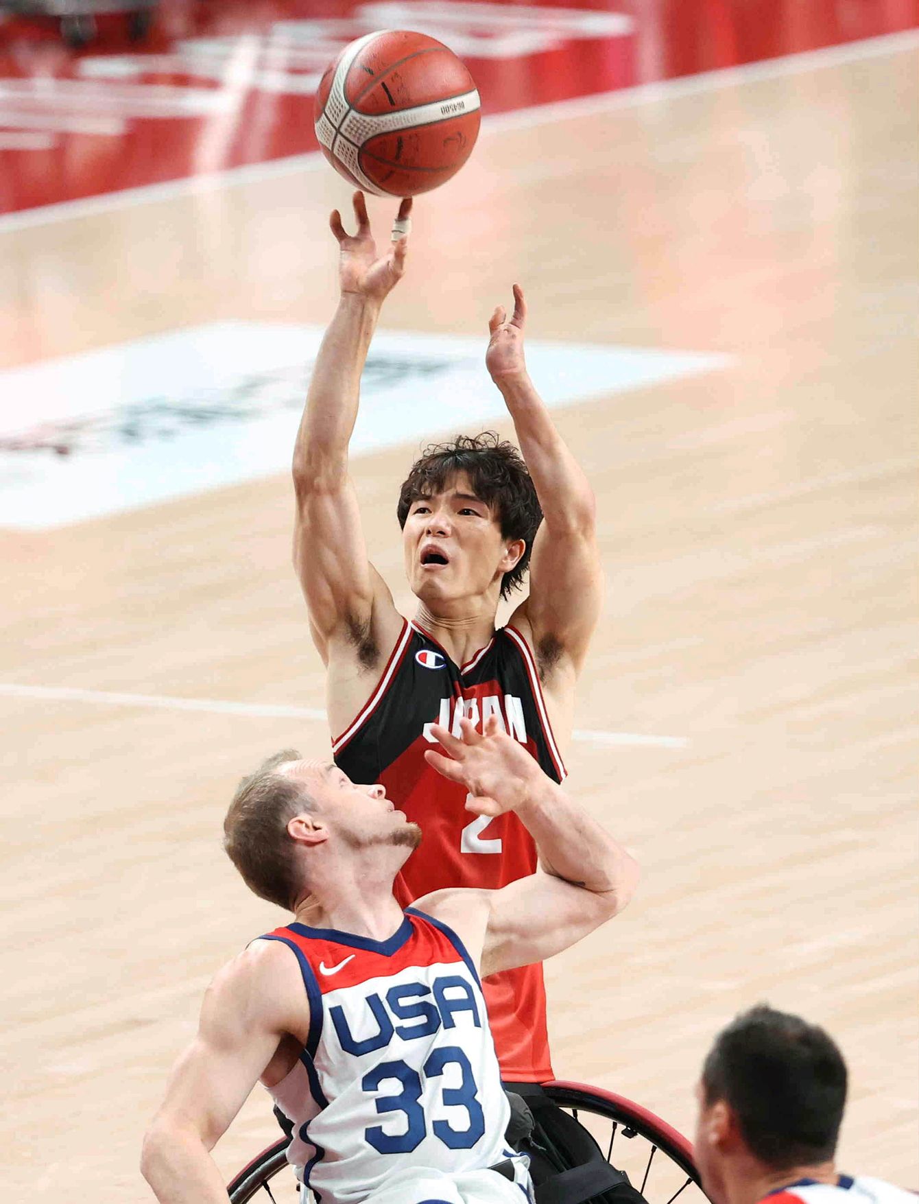 車いすバスケットボール男子決勝戦・アメリカ-日本。シュートを決める鳥海連志=2021年9月5日、東京・有明アリーナ(写真=時事通信フォト)