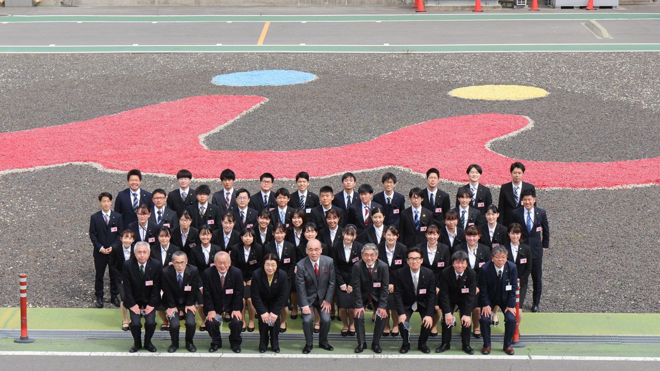 2021年4月の入社式で。前列左から4人目が中島さん。右隣が浅田剛夫会長