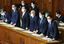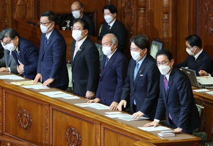 参院本会議で2021年度補正予算が賛成多数で可決、成立し、起立する岸田文雄首相(右端)ら=2021年12月20日、国会内