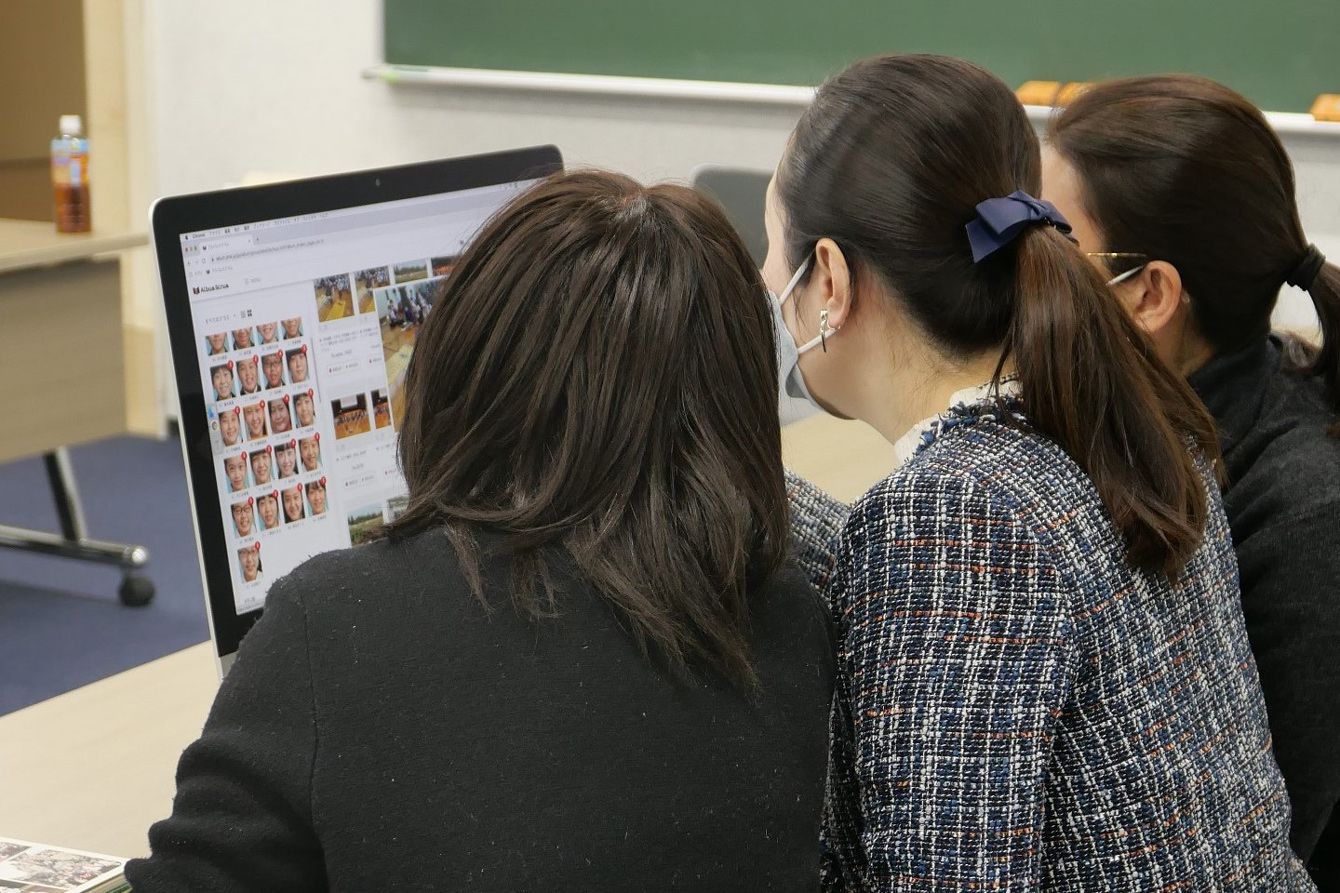 AIを活用した卒業アルバム制作システム「アルバムスクラム」を使って写真選定を行う保護者ら。2021年12月、埼玉県さいたま市のさとえ学園小学校で