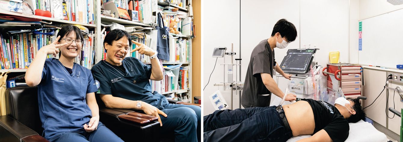 (写真左)総合診療・総合内科センター(GGG)の運営を担当している救急部の石本貴美さんと。/(写真右)救急科の診察室。初期診療に使うエコー、CT室、グラム染色室などの設備がそろっている。