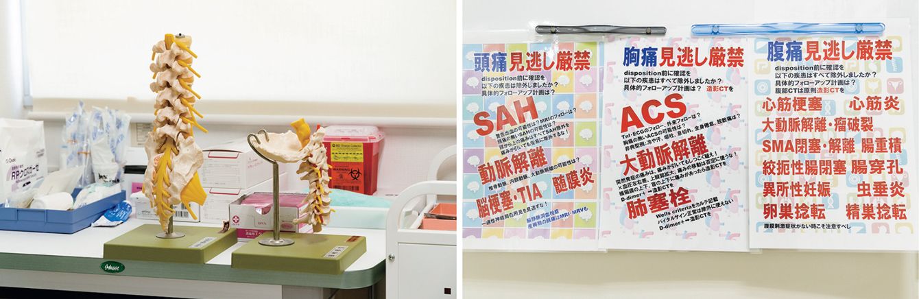 (左)同大病院では初診の患者は総合診療部が担当。診察室にはさまざまな疾患の診断に必要な道具がそろっている。患者の症状の原因を探っていくさまは「名探偵コナンのようです」と林さんは言う/(右)診療室の廊下。常にスタッフの目に入る位置に林さんが作った注意喚起が