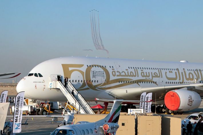 ドバイエアショーの開幕フライトディスプレイとエミレーツ航空のA380型機
