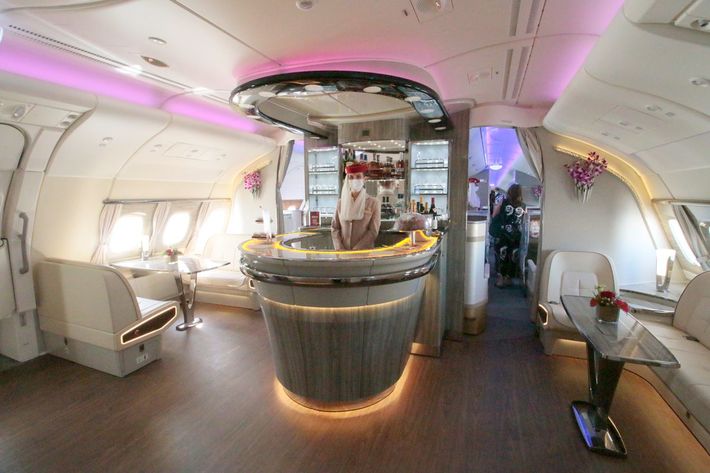 エミレーツ航空A380機内のラウンジとバーカウンター