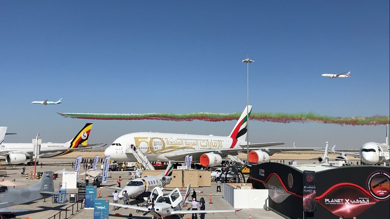 ドバイエアショーの開幕フライトディスプレイとエミレーツ航空のA380型機