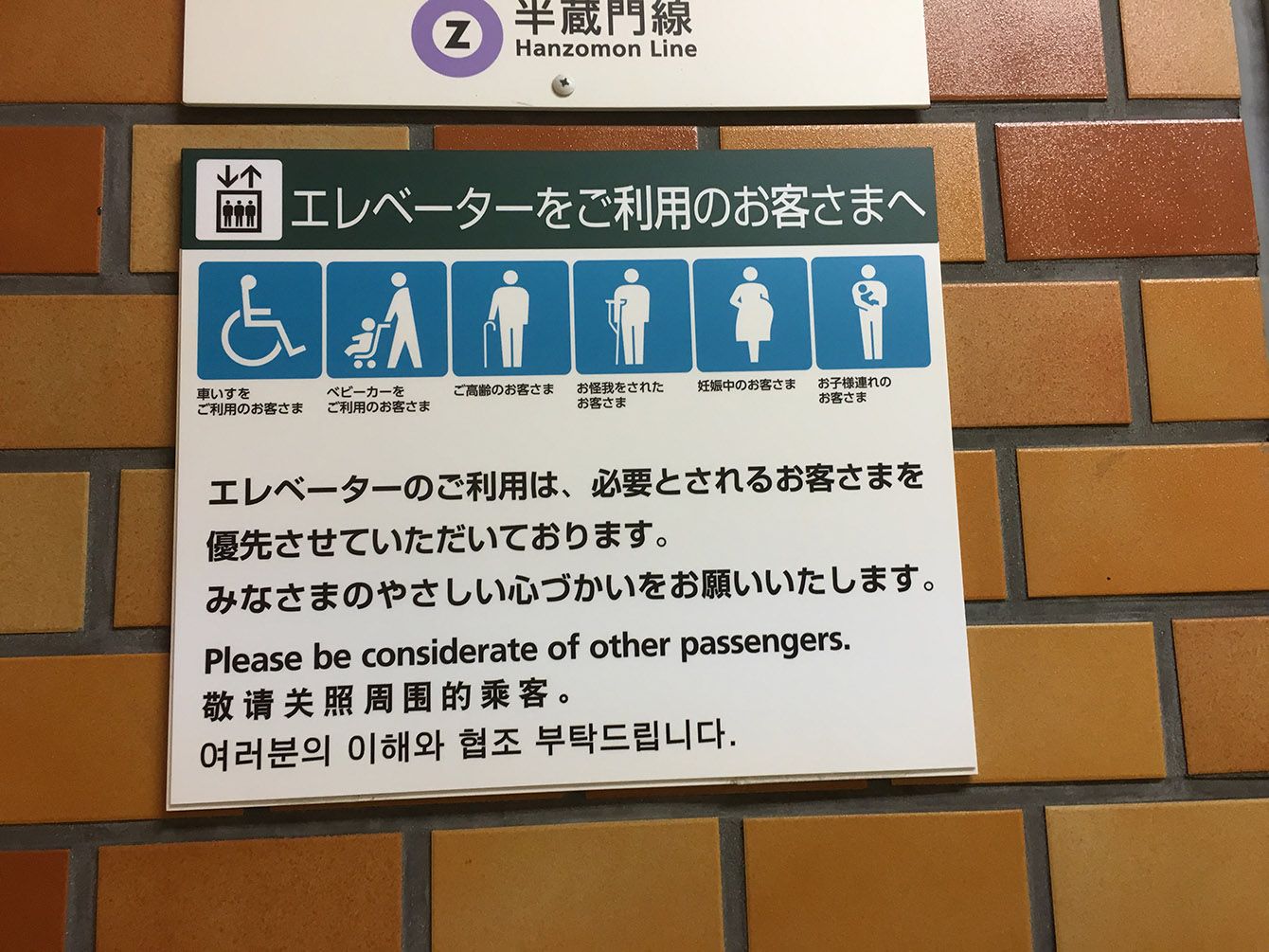 「優先させていただいております」と書かれた東京メトロ半蔵門線の案内板