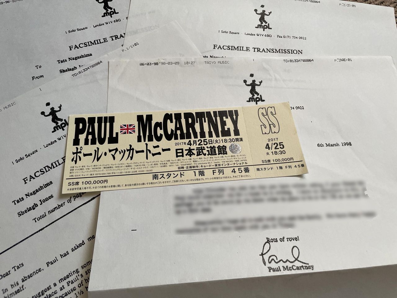 ポール・マッカートニー日本公演のチケットと、ポールから永島氏にあてた私信