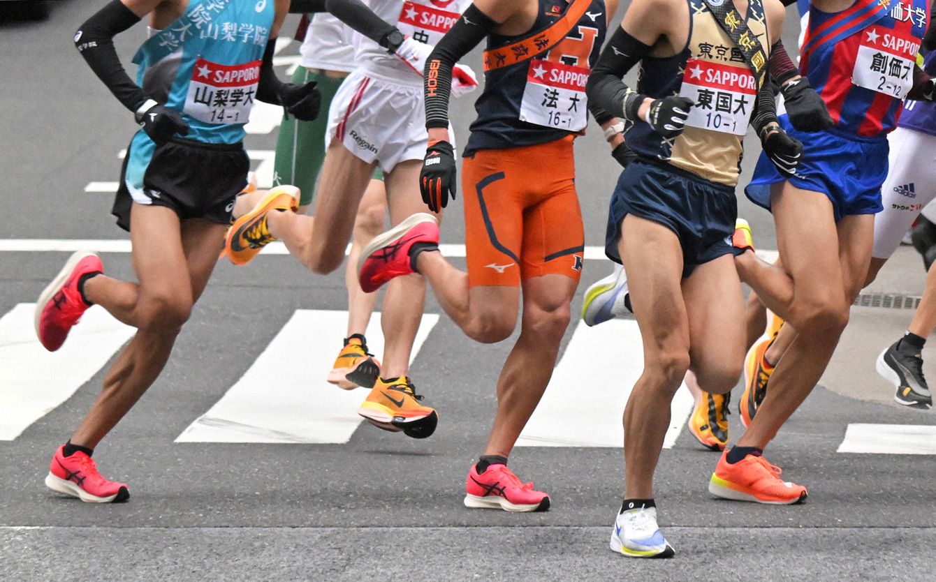 第98回箱根駅伝で、ナイキやアシックスなどのメーカーのシューズを履いてレースに挑む選手たち=東京都千代田区で2022年1月2日、手塚耕一郎撮影