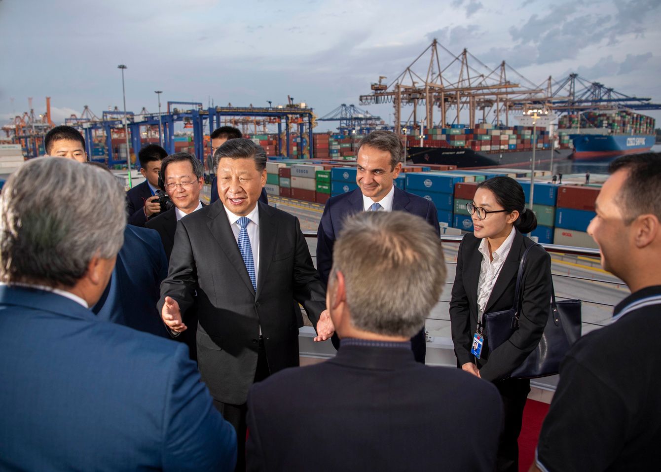 習近平国家主席がギリシャのピレウス港を訪れ、現地スタッフの代表と談笑している(2019年11月11日)