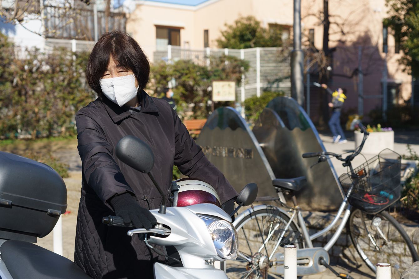 ケアマネージャーの吉野清美さん。移動にはバイクを利用している。