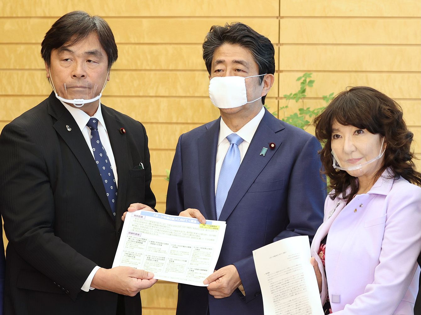 自民党スポーツ立国調査会長の馳浩元文部科学相(左)から提言書を受け取る安倍晋三首相(中央)=2020年6月23日、首相官邸