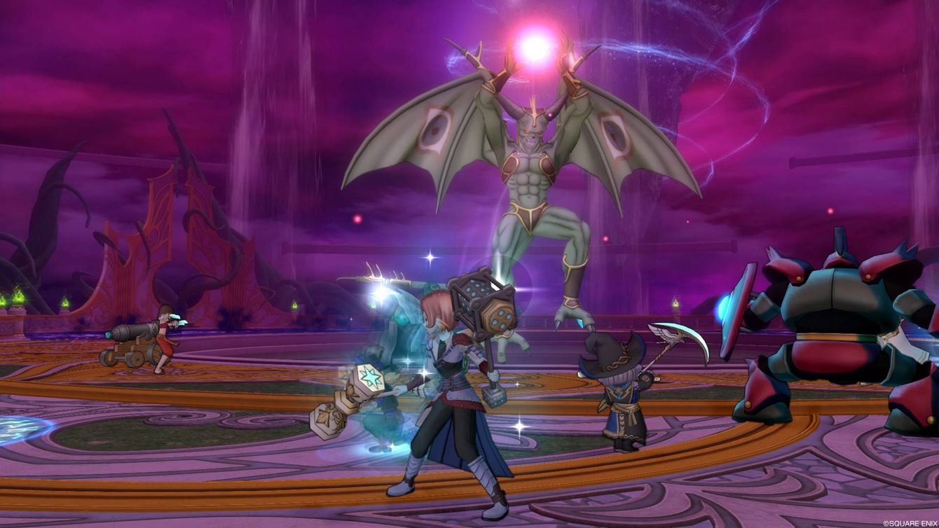 サポート仲間との戦闘風景。従来のドラクエ式コマンドバトルと違い、戦闘フィールドを敵味方が自由に動くことができる。回復呪文や補助呪文が得意な旅芸人(左端)が敵から離れた位置から援護するという戦い方も可能なのだ。