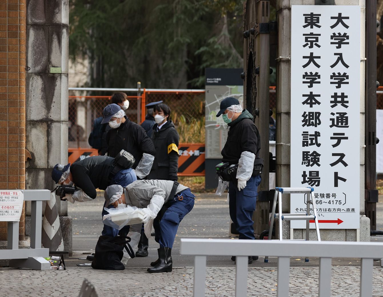 大学入学共通テストを受けに来ていた受験生が切り付けられた現場周辺を調べる捜査関係者=2022年1月15日午前、東京都文京区