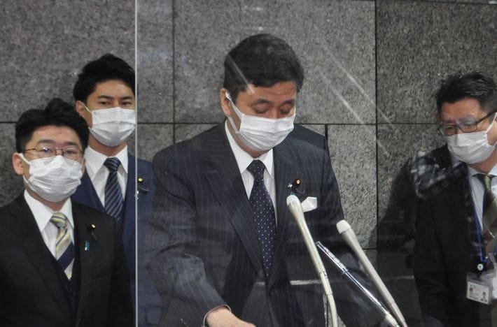 北朝鮮による弾道ミサイル発射を受け、記者会見する岸信夫防衛相(中央)=2022年1月17日午前、東京都新宿区の防衛省