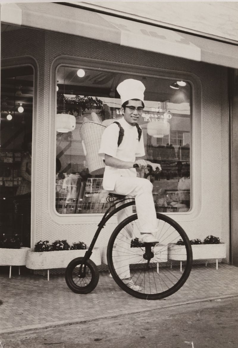 アンティーク自転車に乗って宣伝する二代目の健治さん(写真=『