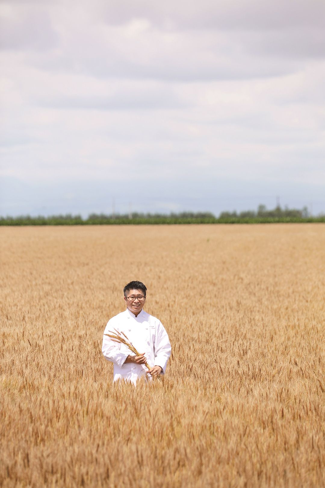 収穫前の小麦畑に立つ雅則社長(写真=『