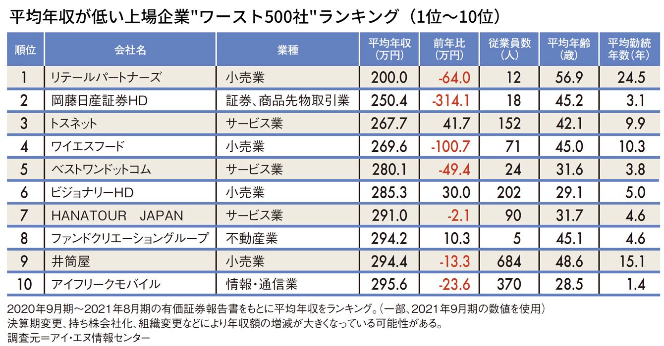 「1位はスーパー3社の持株会社で200万円」平均年収が低いワースト500社ランキング2021