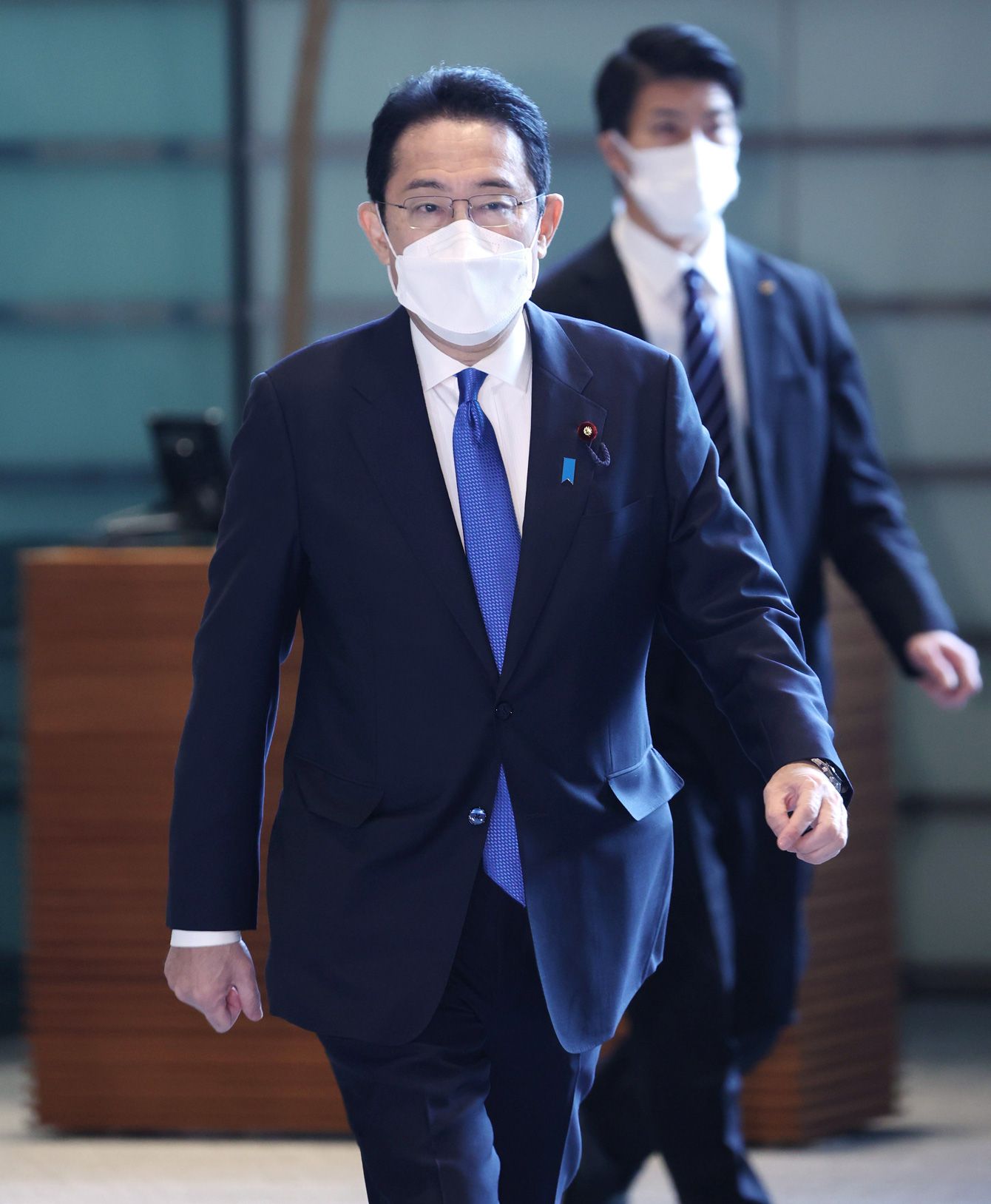 官邸に入る岸田文雄首相=2022年2月4日、東京・永田町