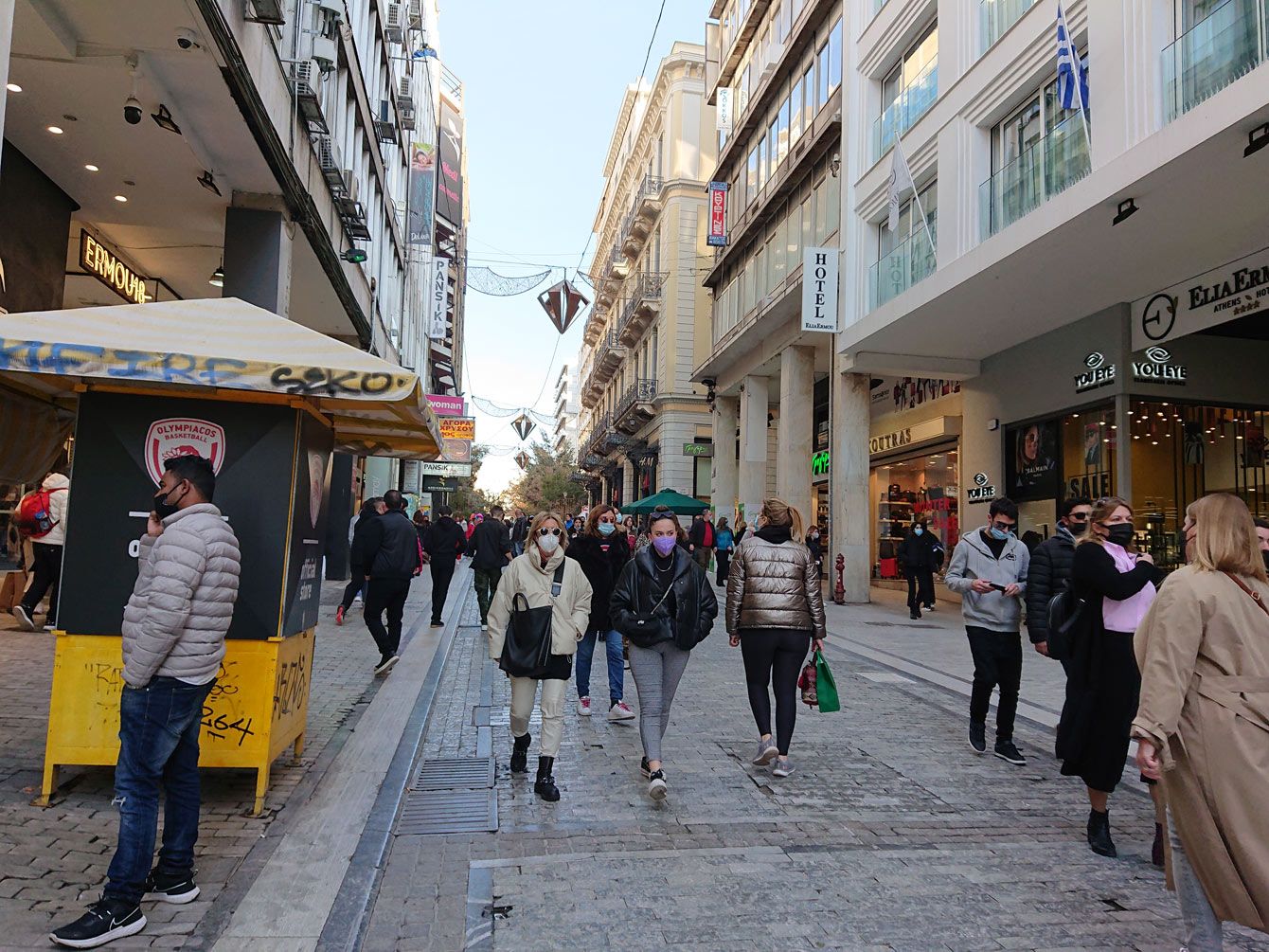 アテネ都心のショッピングストリート・エルムー通り。各店舗の入り口ではワクチンパスとIDの確認、人数制限が行われている。
