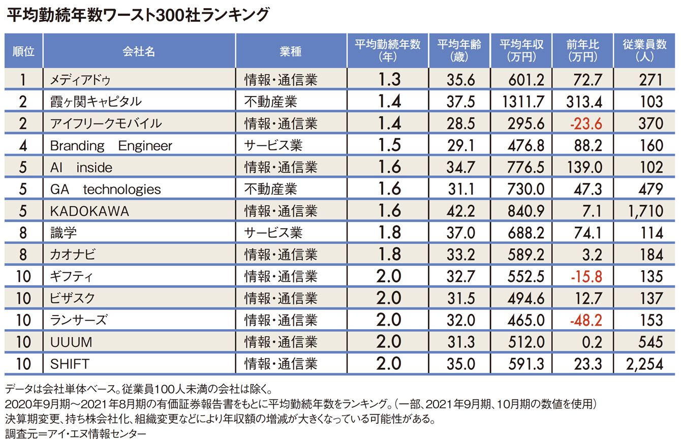 「最短は電子書籍配信会社の1.3年」平均勤続年数ワースト300社ランキング2021