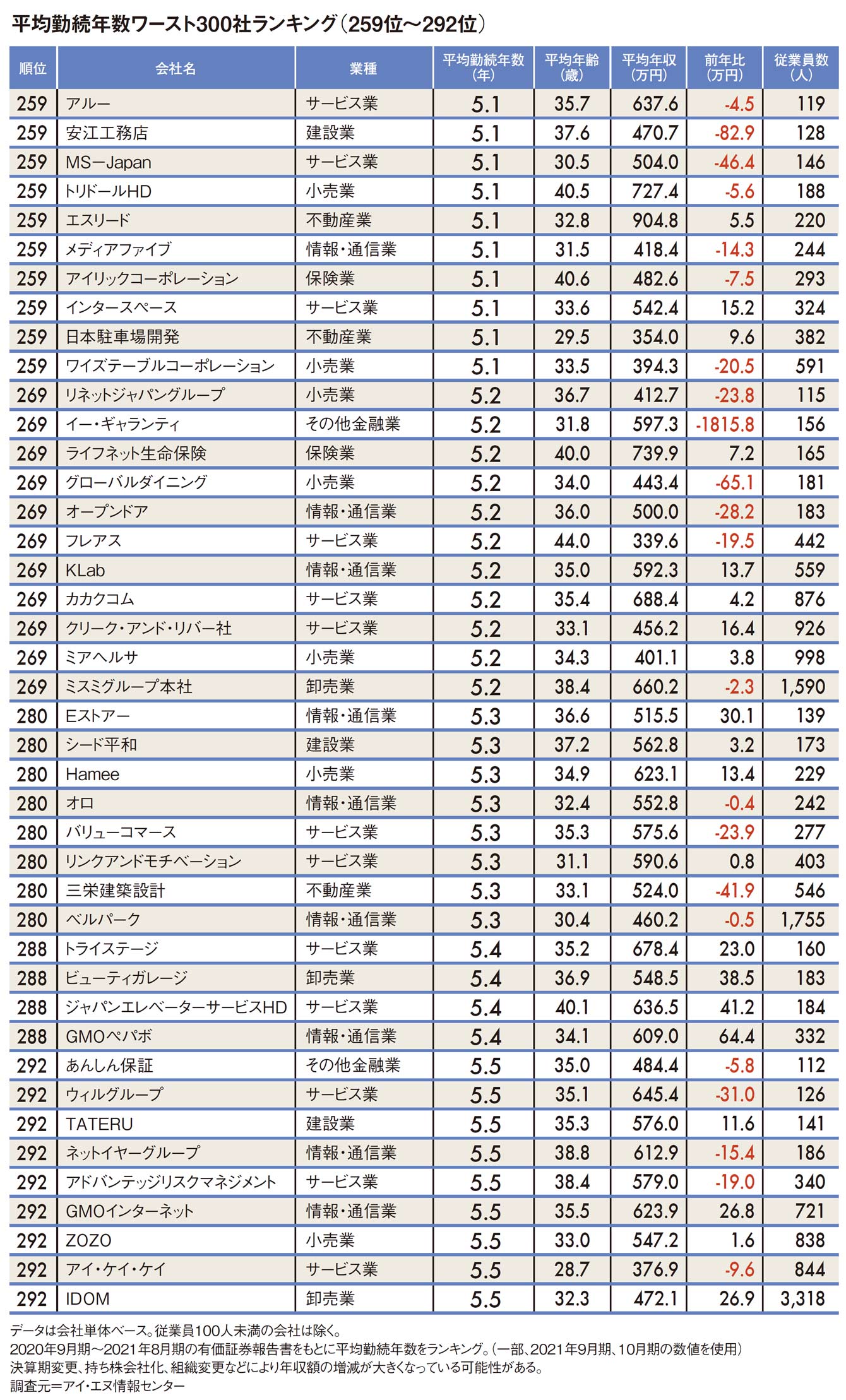 「最短は電子書籍配信会社の1.3年」平均勤続年数ワースト300社ランキング2021