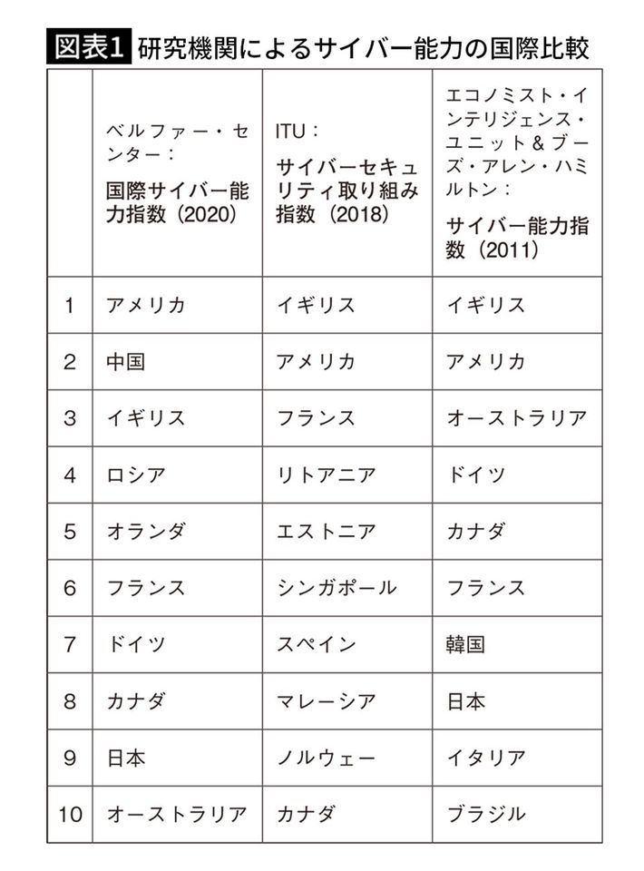 研究機関によるサイバー能力の国際比較(出所=中谷昇『
