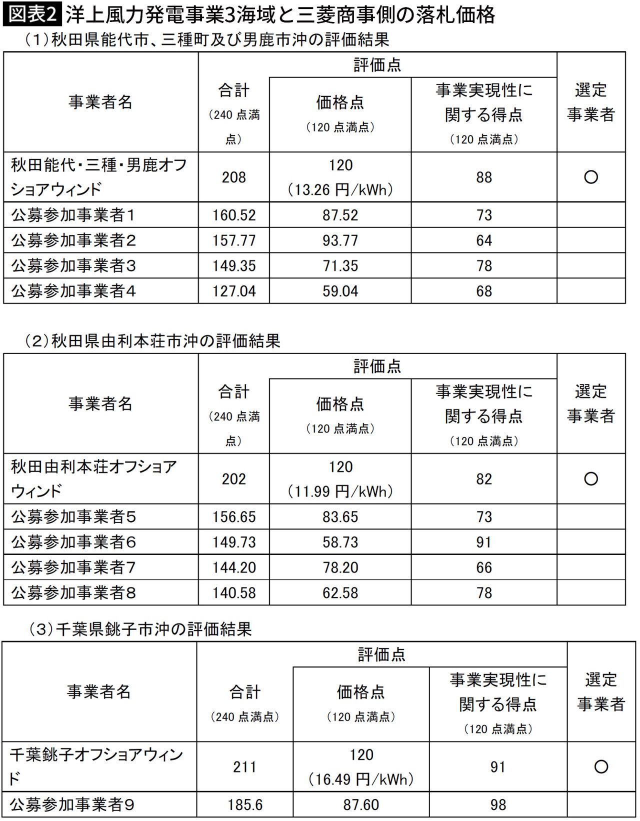 『秋田県能代市、三種町及び男鹿市沖』、『秋田県由利本荘市沖』、『千葉県銚子市沖』における洋上風力発電事業者の選定について