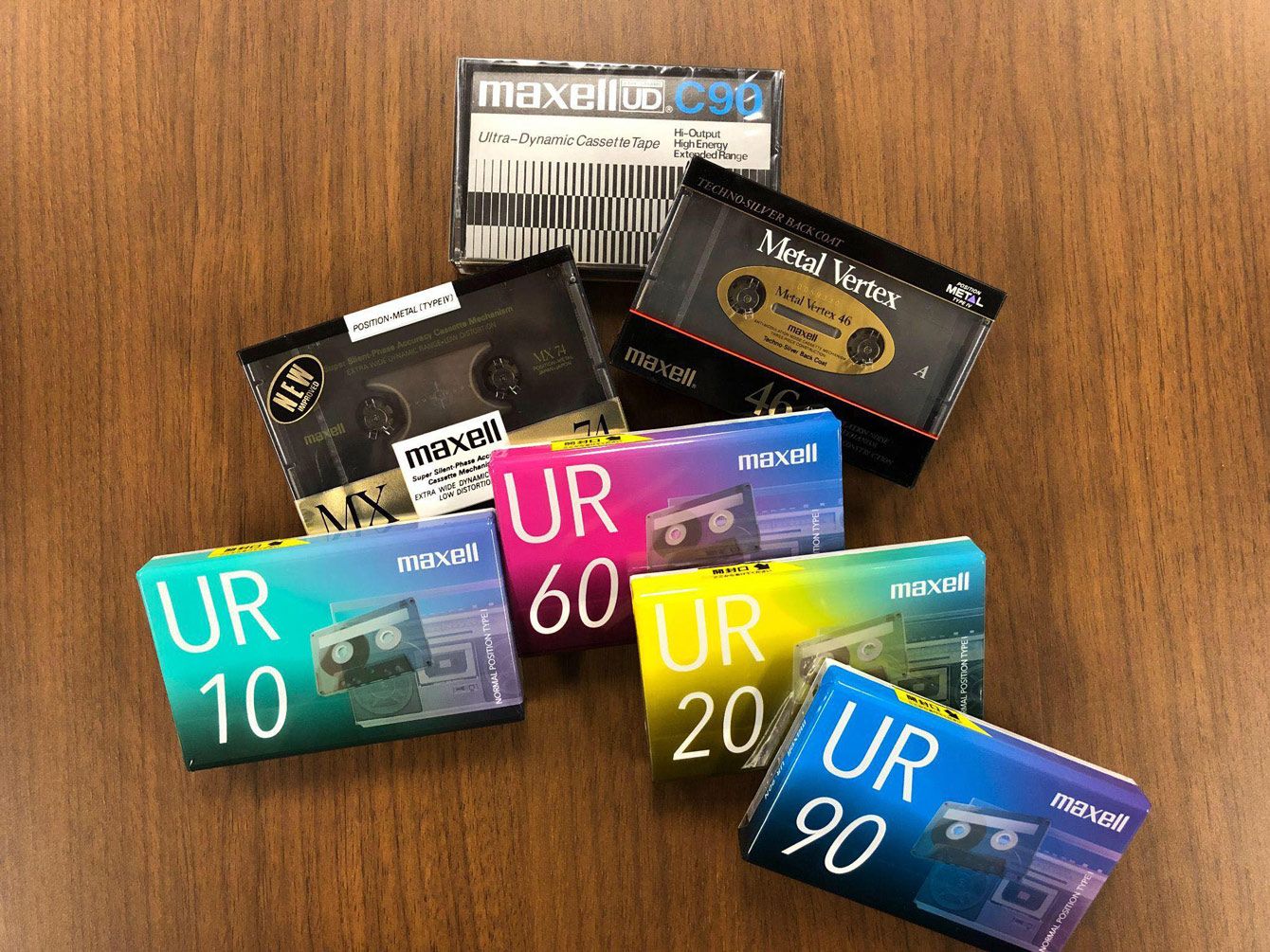 マクセルがこれまで発売した歴代カセットテープのラインナップの一部。現在は手前の「UR」シリーズのみの販売となっている