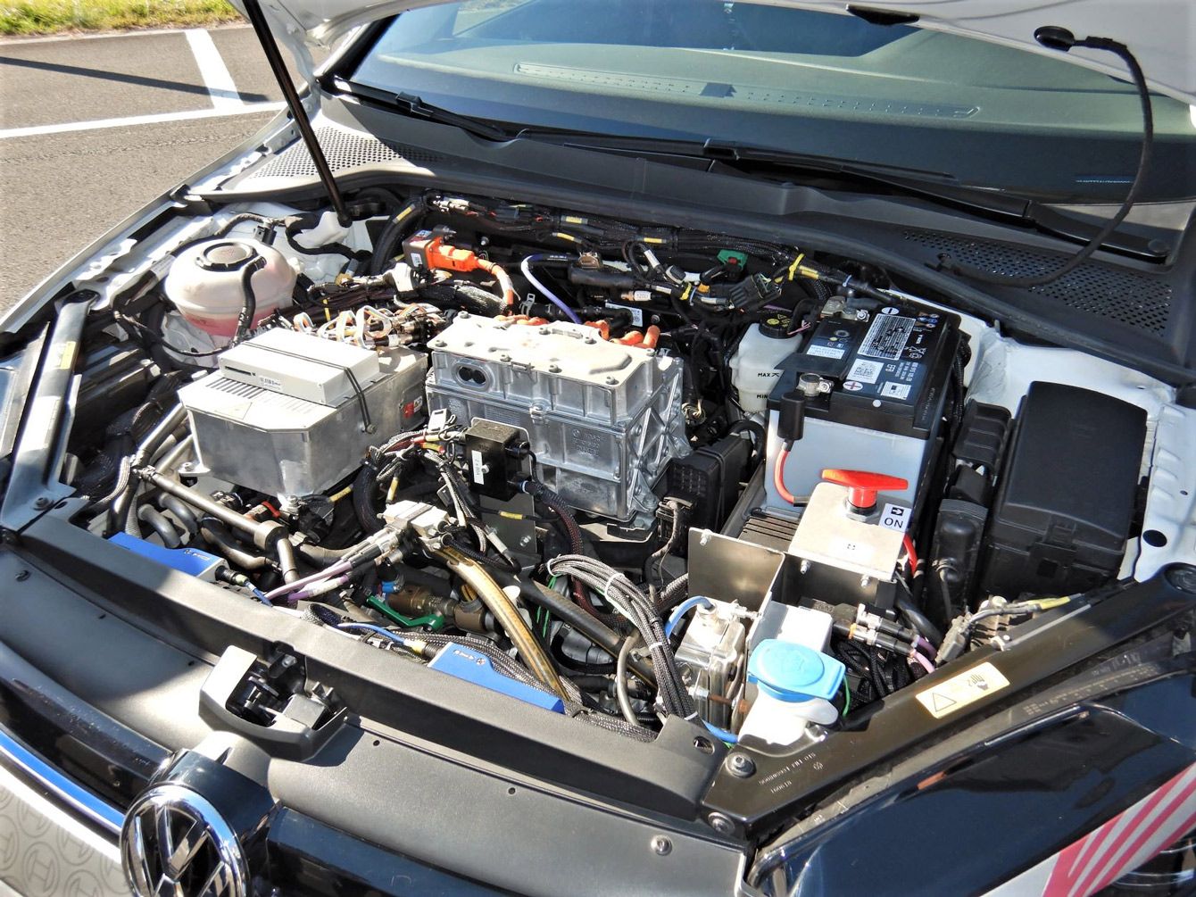 CVT4EVのボンネット内部。画面右側に減速機代わりのCVTが収まる。CVTのベルトを構成する金属コマのエレメント幅は、内燃機関(主に2.5lガソリンエンジン)向けCVTで普及している24mmとした