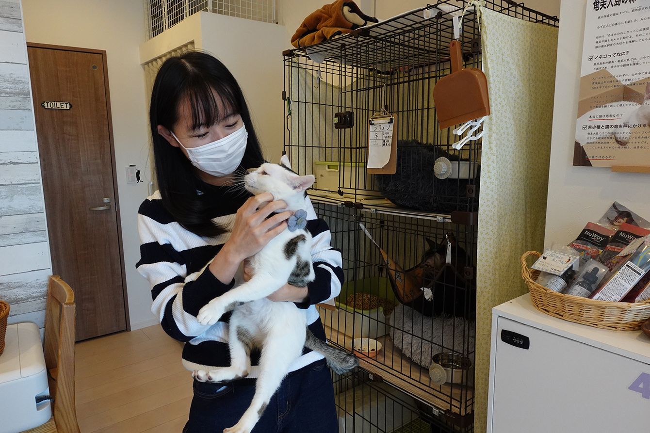 奄美大島のノネコ管理計画で捕獲された猫「まめぼっくり」とボランティアの大学生・佐藤七恵さん