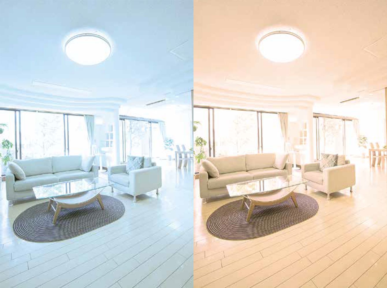 脳を活性化させ、仕事や勉強の効率を高めるのは青白い「昼光色」(左)。一方、オレンジ色の「電球色」(右)はリラックスを促し、創造性を高める(出所=南涼子『