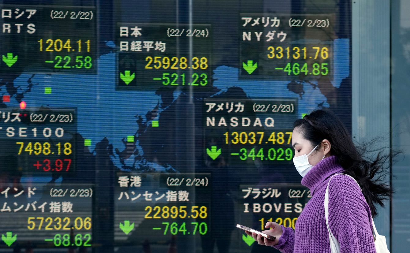 2022年2月24日、日本の東京で、株式市場の表示板の前を歩く人。日経平均株価は478.79ポイント(1.81%)下落し、2020年11月以来の安値となる2万5970.82円で取引を終えました。