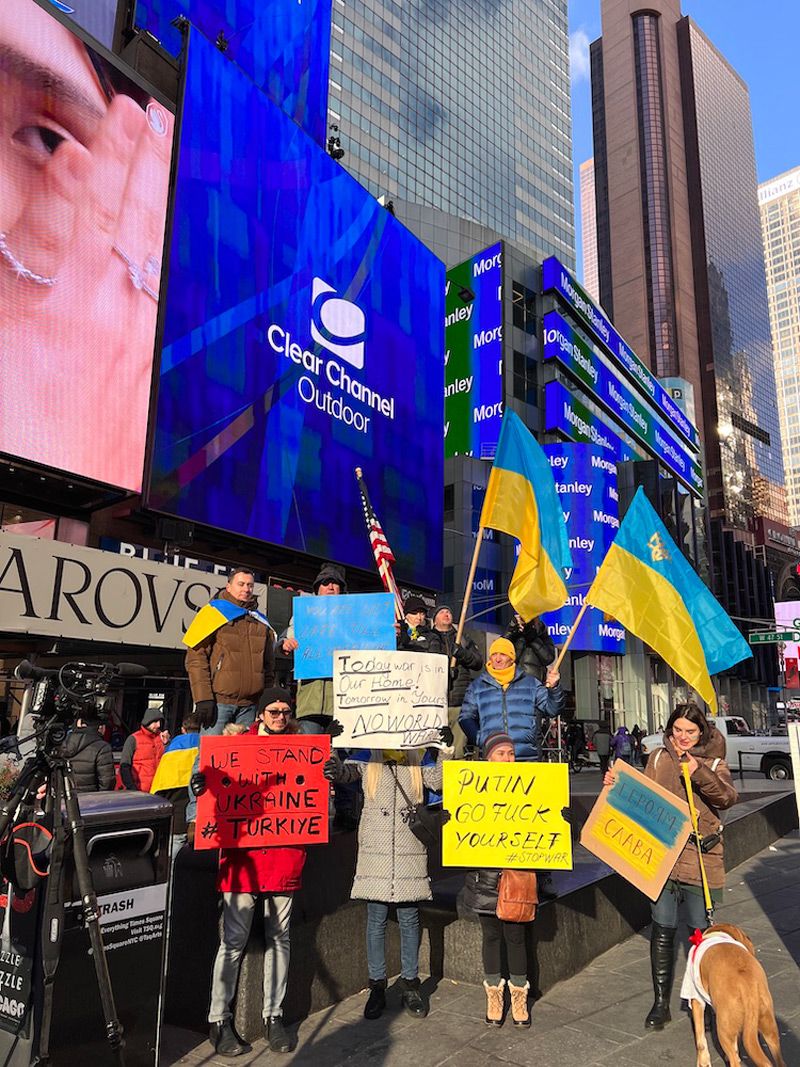 NYのタイムズスクエア周辺で行われたロシアによるウクライナ軍事侵攻に抗議する人々