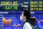 2022年2月24日、東京でマーケットボードの前を歩く人。日経平均株価は478.79ポイント(1.81%)下落し、2020年11月以来の安値となる2万5970円82銭で取引を終えた。