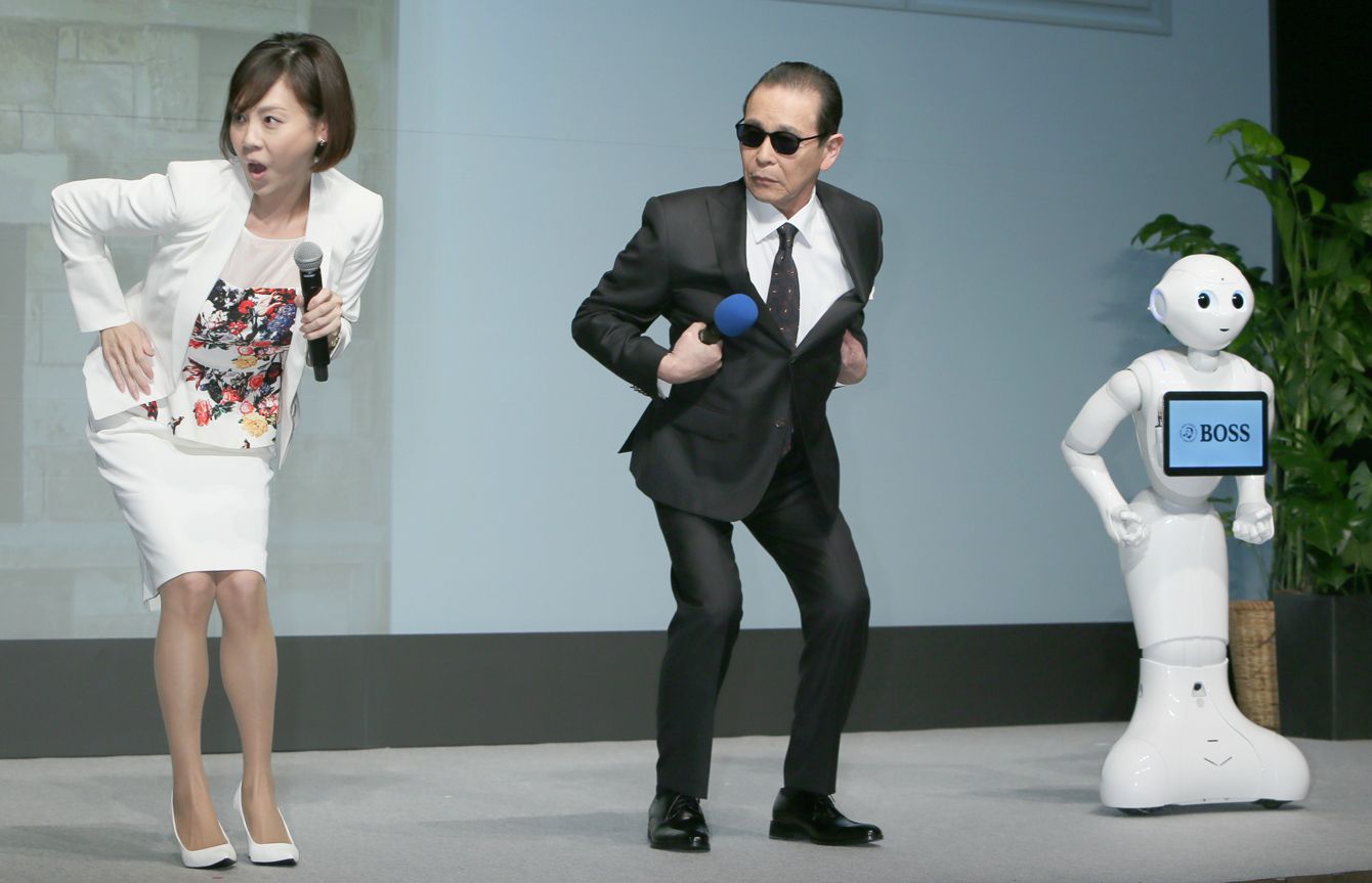 タレントのタモリが2015年1月29日、サントリー食品インターナショナルの缶コーヒー「BOSS」の新キャンペーン・新CM発表会に出席。フリーアナウンサーの高橋真麻とロボット「Pepper」に「コンドルの着地」の物まねを指導した=東京都内