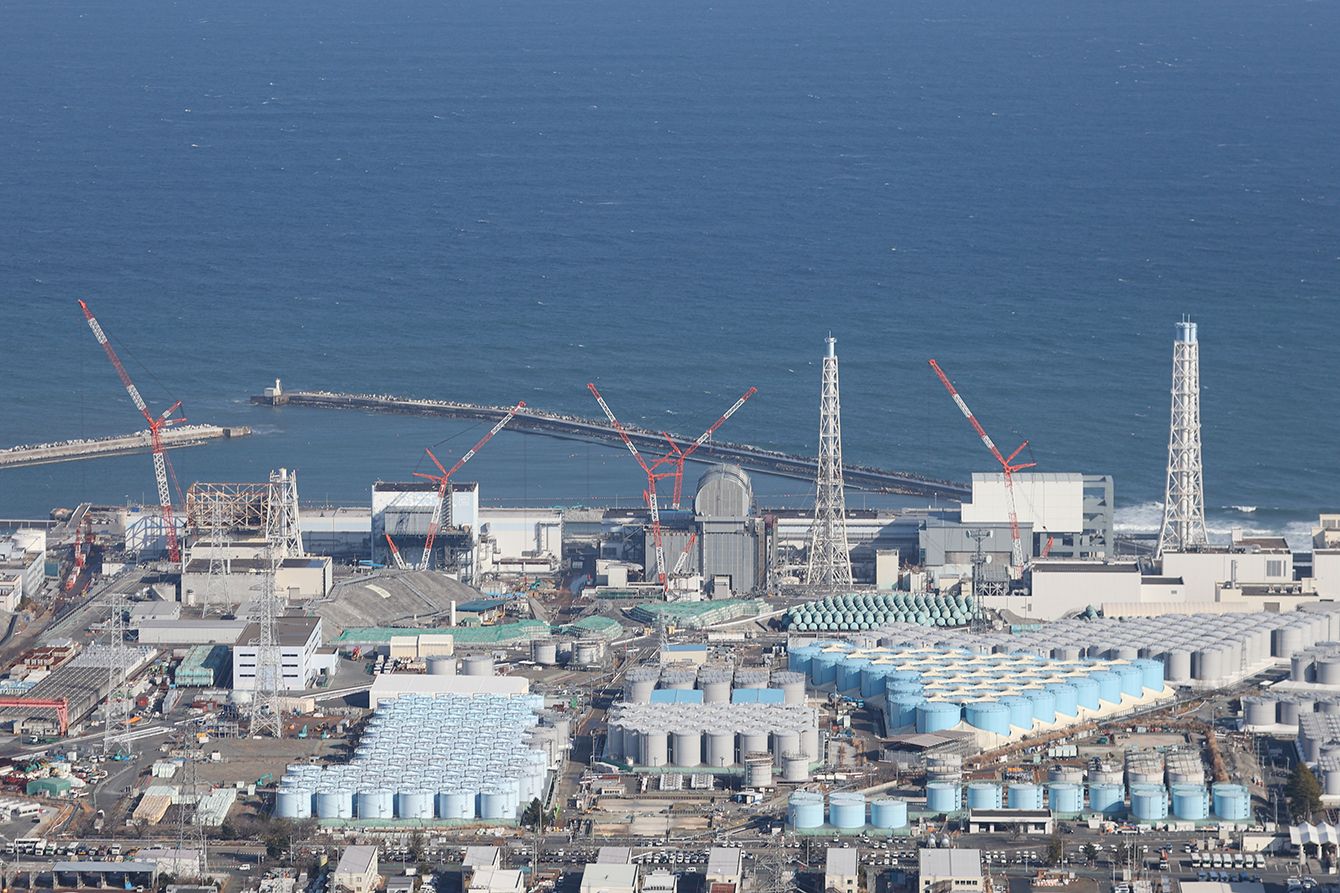 廃炉作業が進められている東京電力福島第1原子力発電所。中央左から1、2、3、4号機の原子炉建屋=2021年2月14日、福島県