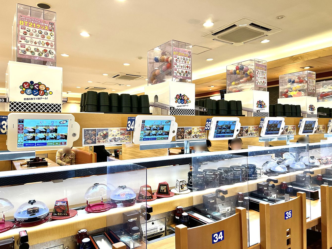 店内の様子。「抗菌寿司カバー鮮度くん」つきの皿が流れる。大手回転寿司チェーンで寿司カバーがあるのはくら寿司だけ。