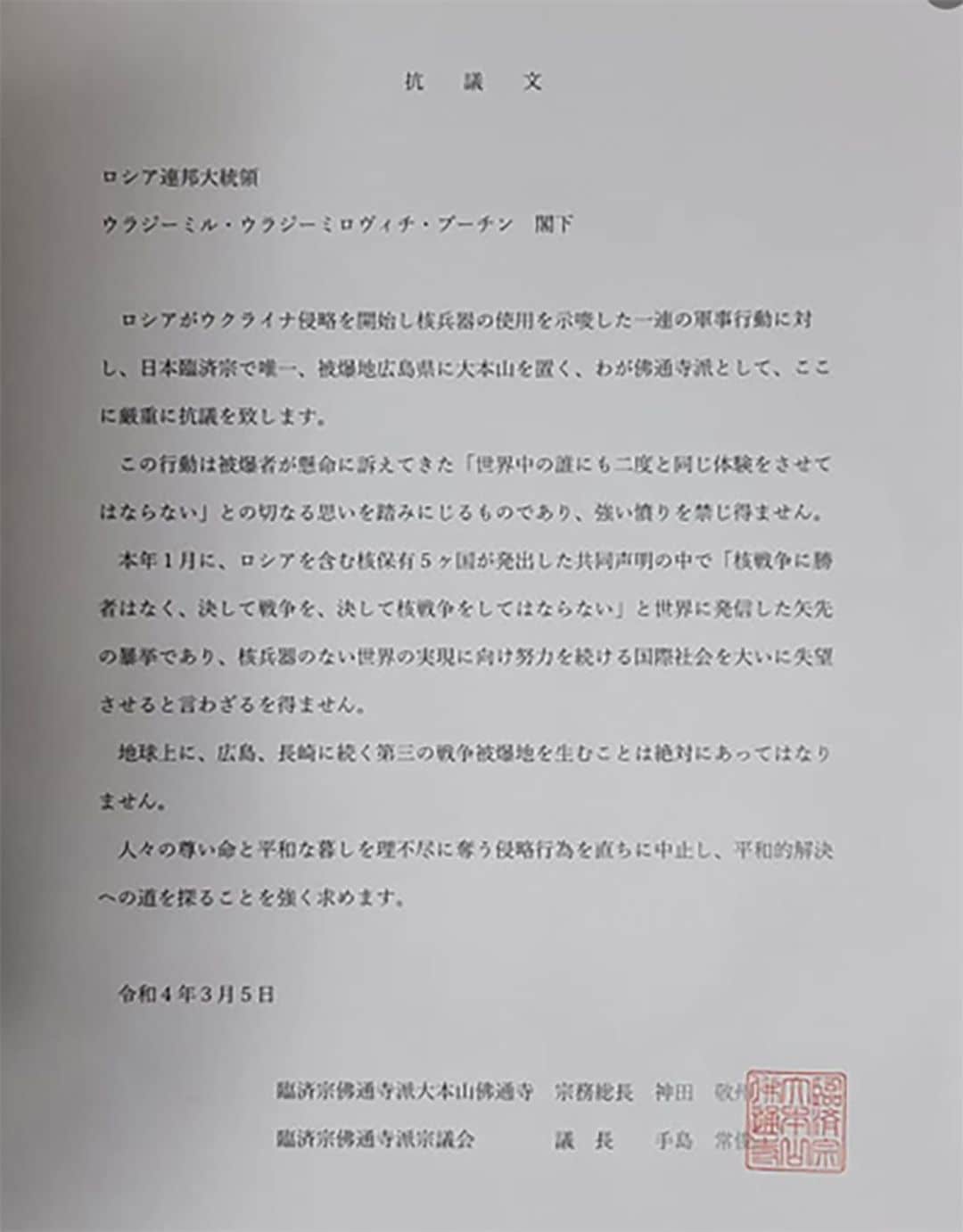 臨済宗佛通寺派によるプーチン大統領宛の抗議文