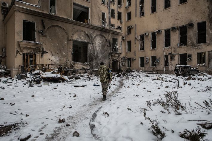 2022年3月9日、ロシアの攻撃が続く中、ウクライナのハリコフ中心部で3月1日に爆撃されたハリコフ知事公邸。