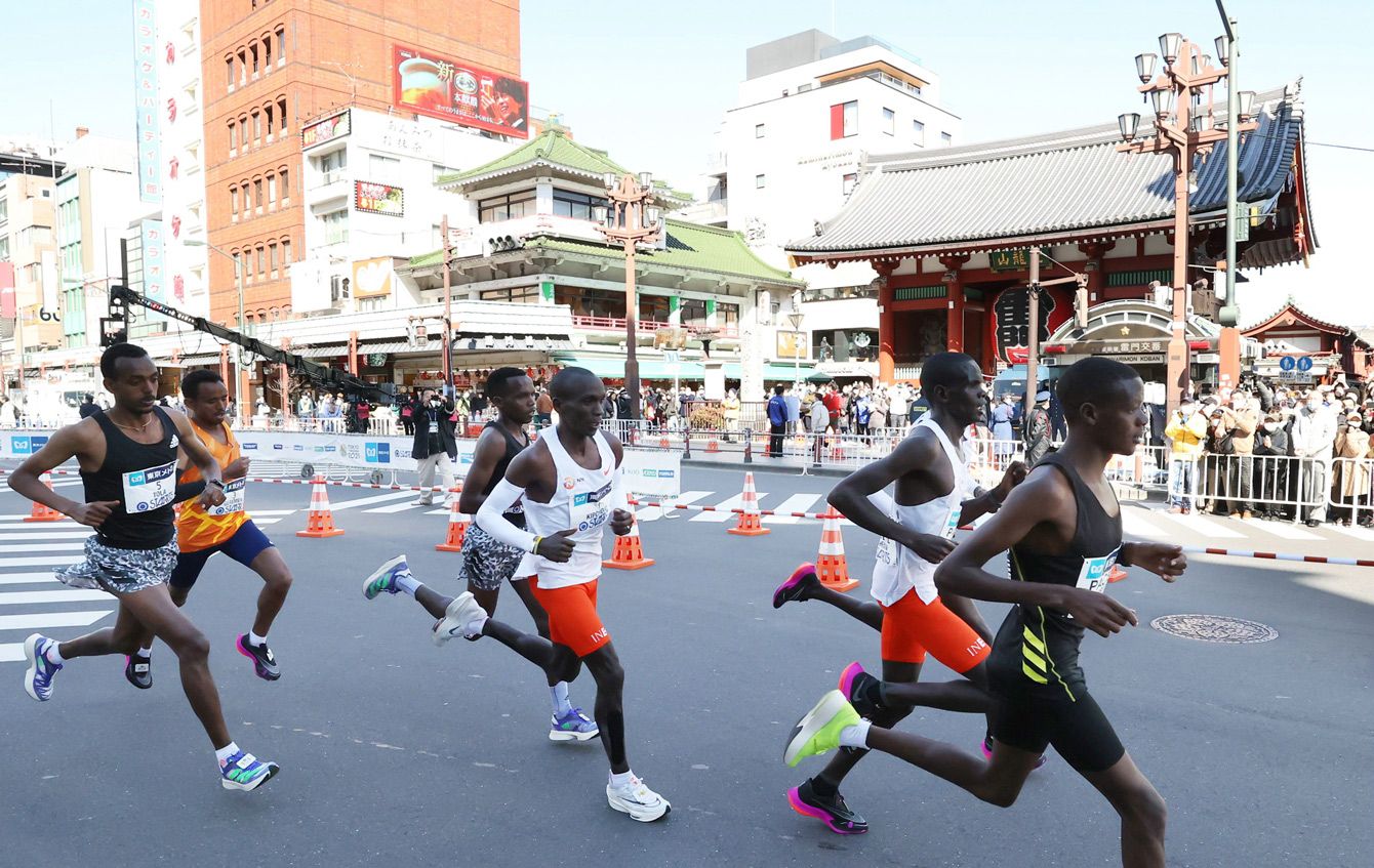 浅草寺の雷門前を通過するエリウド・キプチョゲ(右から3人目、ケニア)ら=2022年3月6日、東京都台東区[代表撮影]