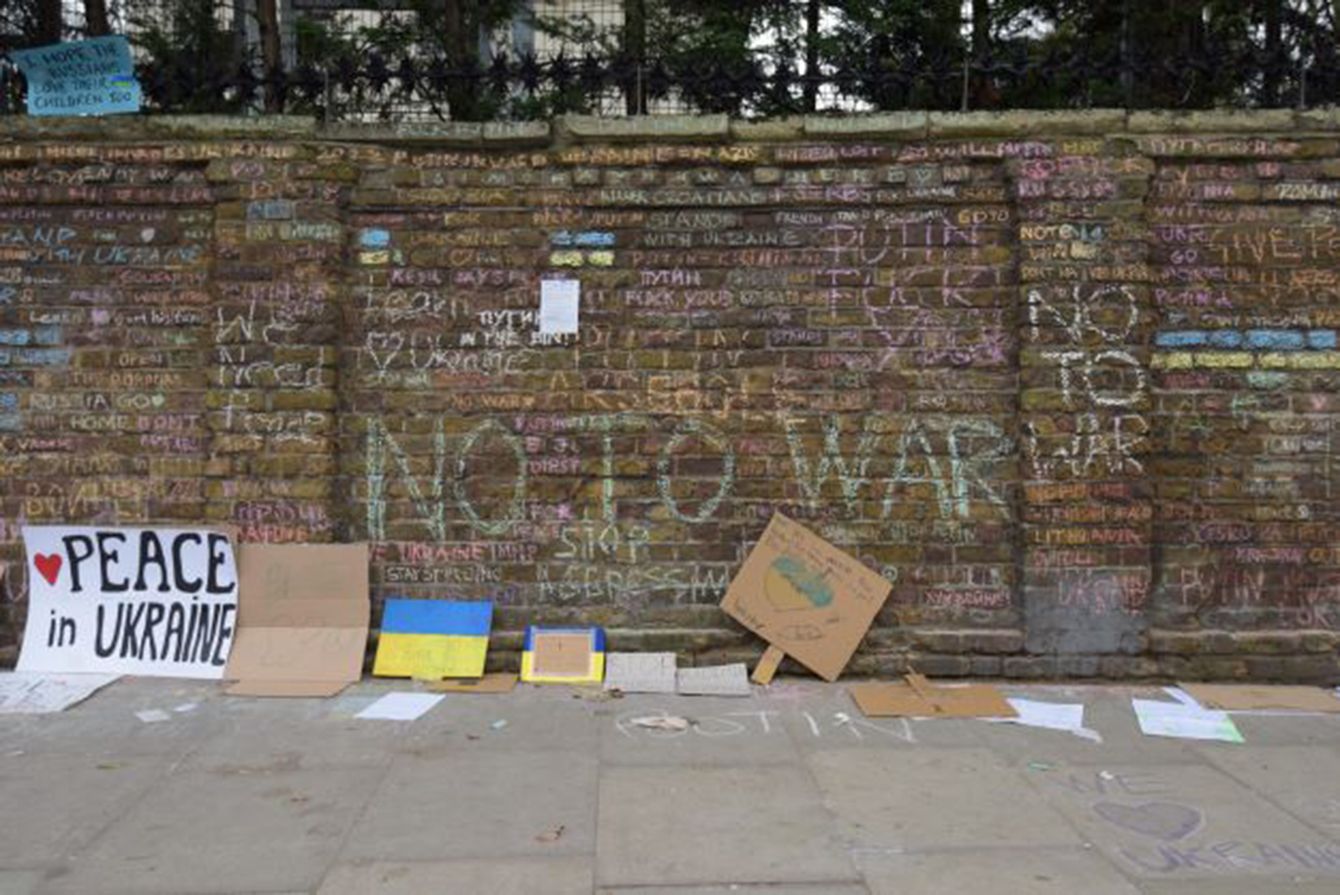 在英ロシア大使館前。壁面は「NO TO WAR」などと平和を訴える落書きで埋め尽くされている