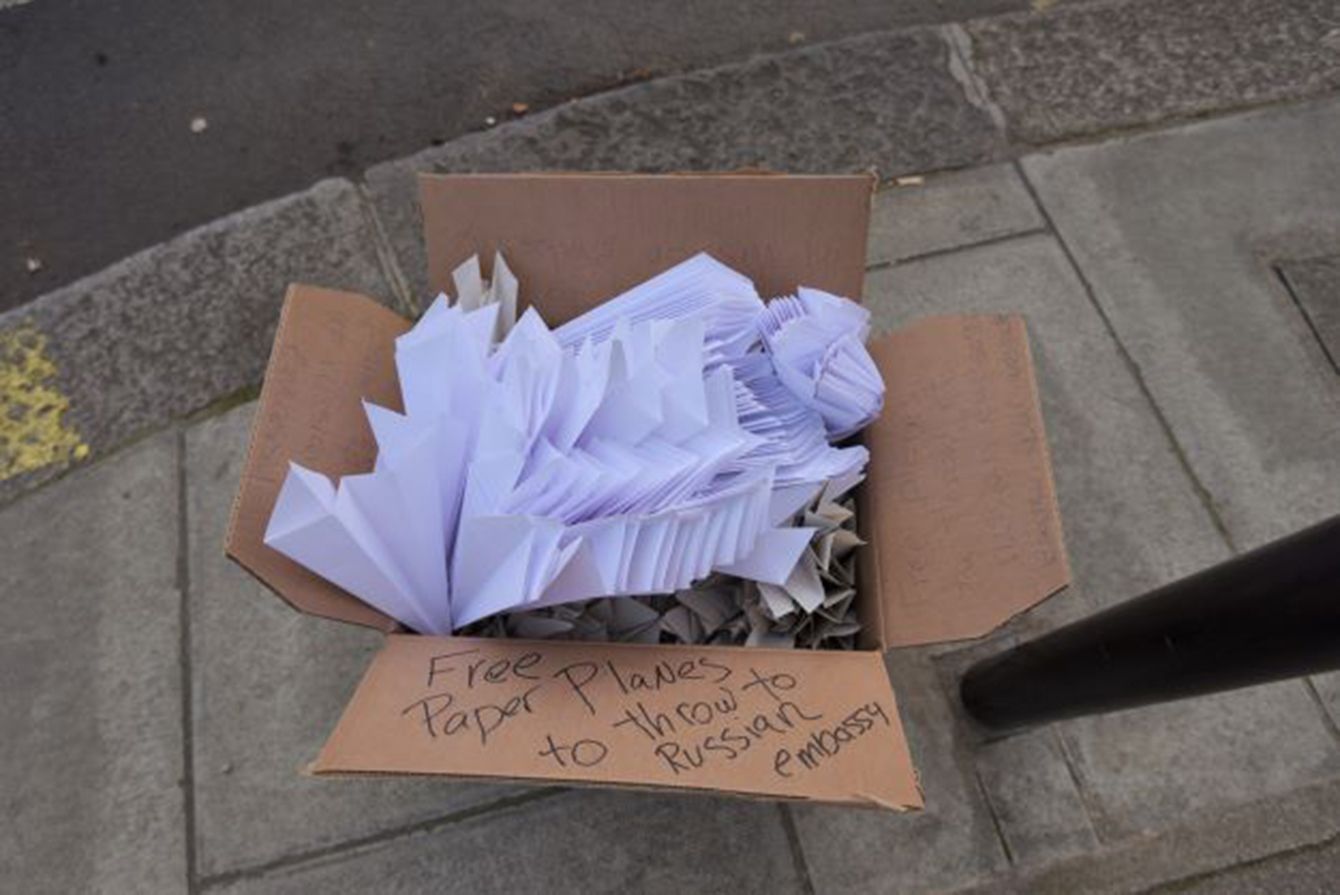 「ロシア大使館へ抗議しよう」と敷地前に置かれた紙飛行機。用意した男性は「ウクライナ空爆への皮肉という意味で」と話してくれた