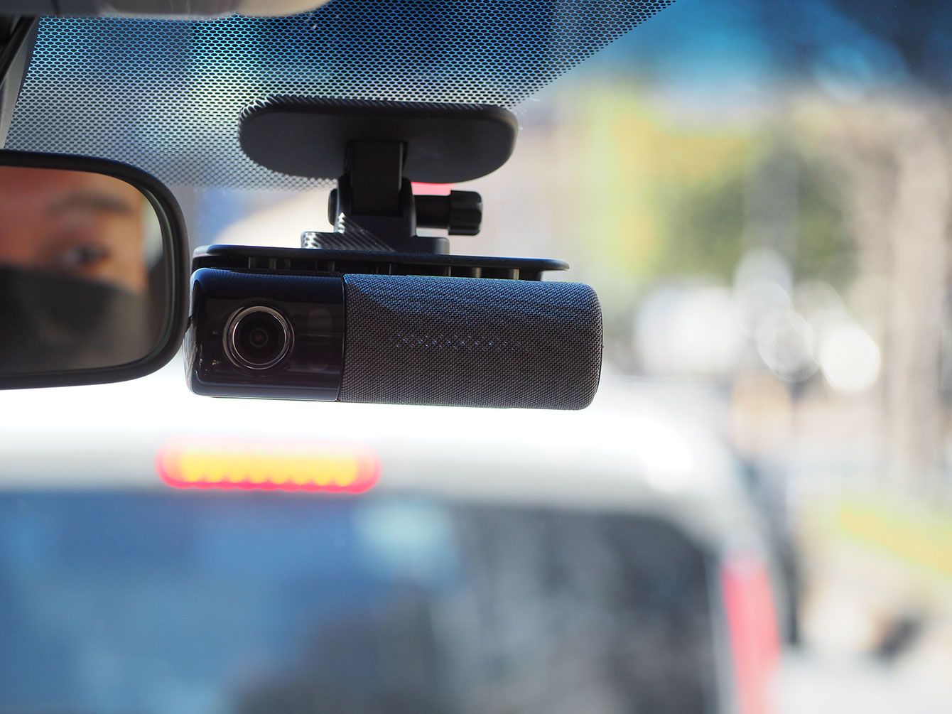 画面のないカーナビ「NP1」。バックミラーの脇にある筐体はドライブレコーダーのようだ。