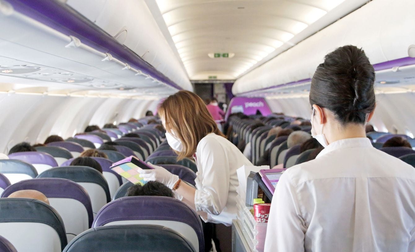 新千歳—那覇線の機内。乗車率は88%に達し、客室乗務員はあわただしい