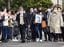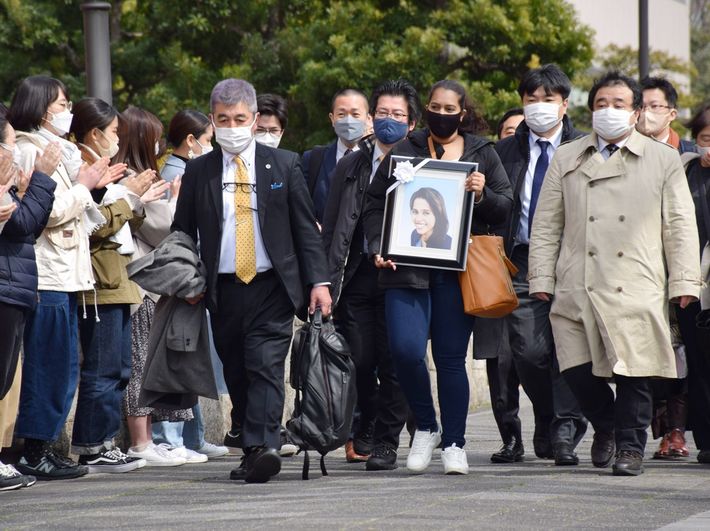 名古屋出入国在留管理局の収容施設でスリランカ人女性ウィシュマ・サンダマリさんが死亡した問題で、提訴のため地裁に向かう妹のポールニマさん(前列中央)ら=2022年3月4日午後、名古屋市