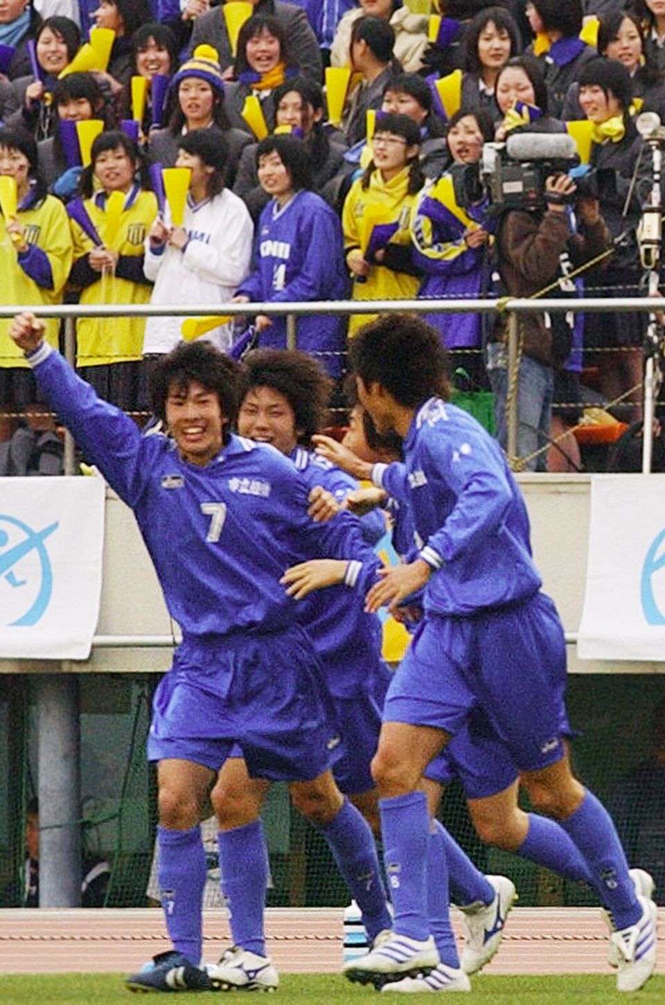 全国高校サッカー選手権決勝・市立船橋(千葉)-国見(長崎)の後半20分、決勝点を挙げガッツポーズをして喜ぶMF小川佳純(左)ら市立船橋イレブン(2003年1月13日、東京・国立競技場)。小川選手の足元に注目。クリックス着用選手が大きな注目を集めた最後の光景である。