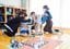 ロボットがゴールするまでのタイムを競う。思い通りに走ってくれずプログラムを修正中。真剣だ。