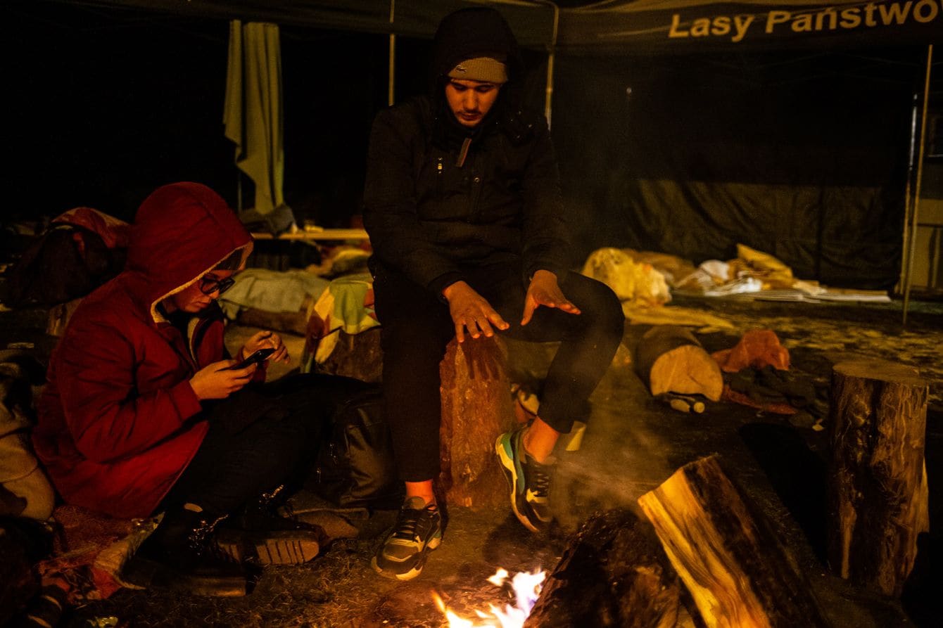 焚火をして暖を取るウクライナからの避難民。ポーランド・フレベンネにて