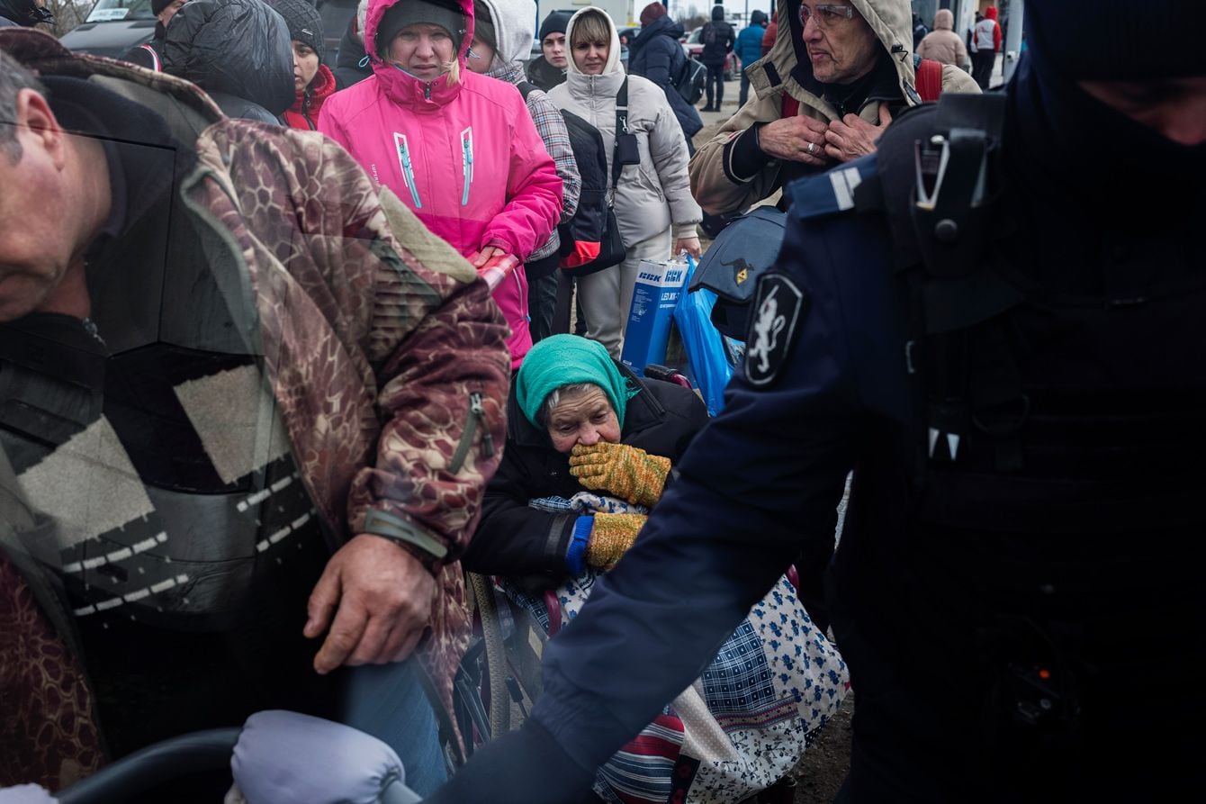 混乱する娘を落ち着かせるために人混みを離れ抱きしめる母親。ウクライナに国境を接するモルドバ共和国のパランカにて。